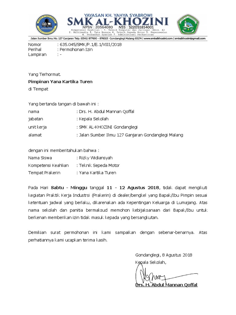 We hope you are all enjoy and finally will get the best picture from our collection that submitted here and also use for suited needs for personal use. Contoh file berikut ini adalah kumpulan dari berbagi sumber tentang contoh surat izin tidak masuk pkl smk yang bisa bapakibu gunakan dan diunduh secara gratis dengan menekan tombol. Surat permohonan prakerin doc.contoh surat izin pkl smk.