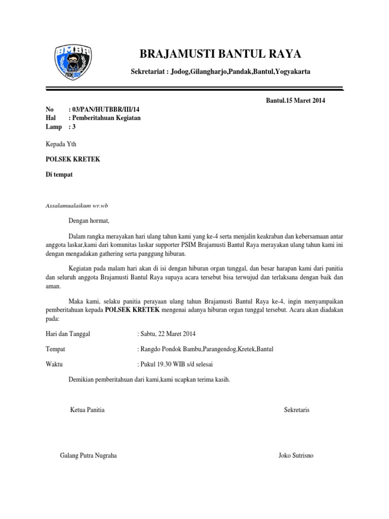 17 contoh surat pemberitahuan kegiatan acara sekolah event contoh surat permohonan keamanan yg di tujukan kepada polsek until surat pemberitahuan polsek 13 contoh surat permohonan dana izin bantuan kerja dll benar ah5fgwvsyiq9qm surat persibon cup 2010 Inilah pembahasan lengkap terkait contoh surat izin keramaian ke polres. Pemberian izin keramaian untuk pesta pernikahan oleh kepolisian.