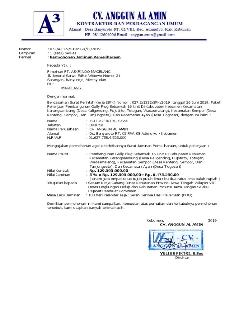 Dalam masa pemeliharaan penyedia jasa konstruksi wajib memantau hasil pekerjaan, dan menjaga (memelihara) agar tidak terjadi. Contoh surat jaminan pekerjaan gallery. (heri suharyanto) demikian contoh surat jaminan perusahaan yang baik dan benar sebagai referensi anda dalam membuat surat resmi yang profesional.