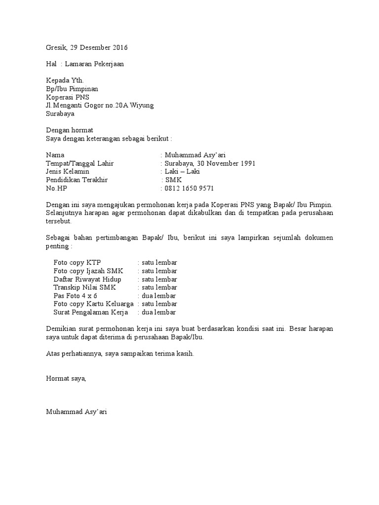 Surat Lamaran Kerja Koperasi Pdf