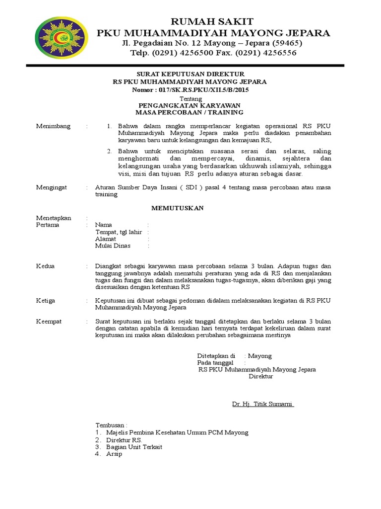Contoh surat keputusan pengangkatan karyawan dll lengkap format 1105 x 1600 pixel. Contoh surat keputusan direktur pelayanan pasien. Berdasarkan peraturan manajemen perusahaan pt xxx xxx, serta hasil kinerja selama masa training ini.